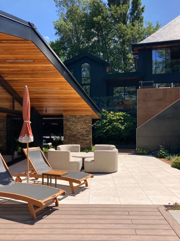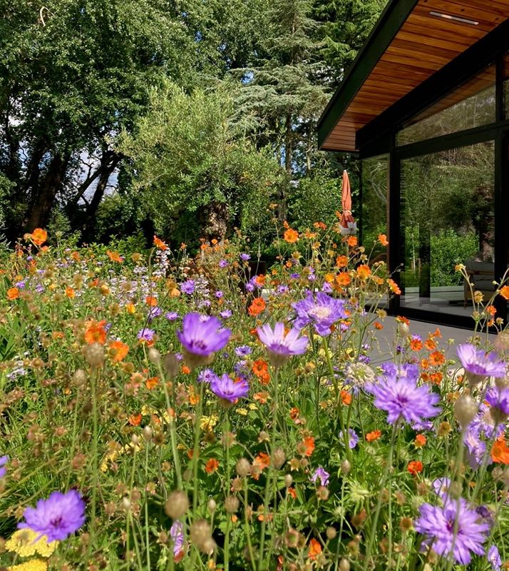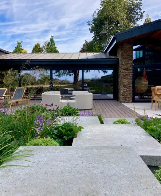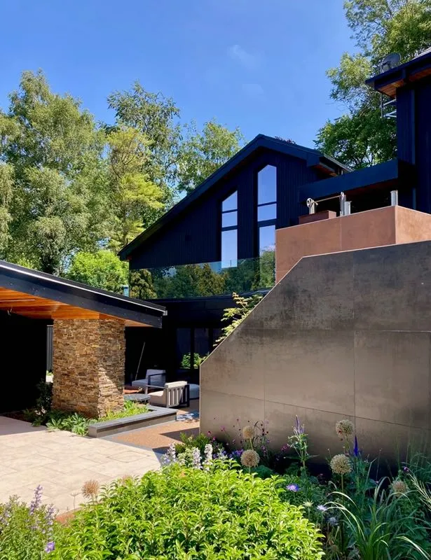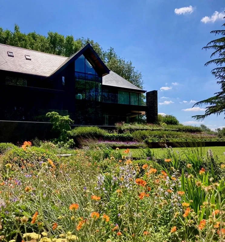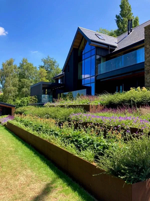 A complex and exposed 2 acre site on multiple levels in South Nottinghamshire has been designed to create a series of sleek entertaining terraces and raised planters to the main house and pool complex.  Corten steel, porcelain and decking were selected as the key materials to offset the timber clad house.  Generous borders were planted with semi mature trees and large Prunus lusitanica ‘Domes’, interspersed with naturalistic planting in a palette of purples, blues and oranges.  A large formal lawn was created and a bank designed to flow down to the lower lawn and woodland and stream beyond.