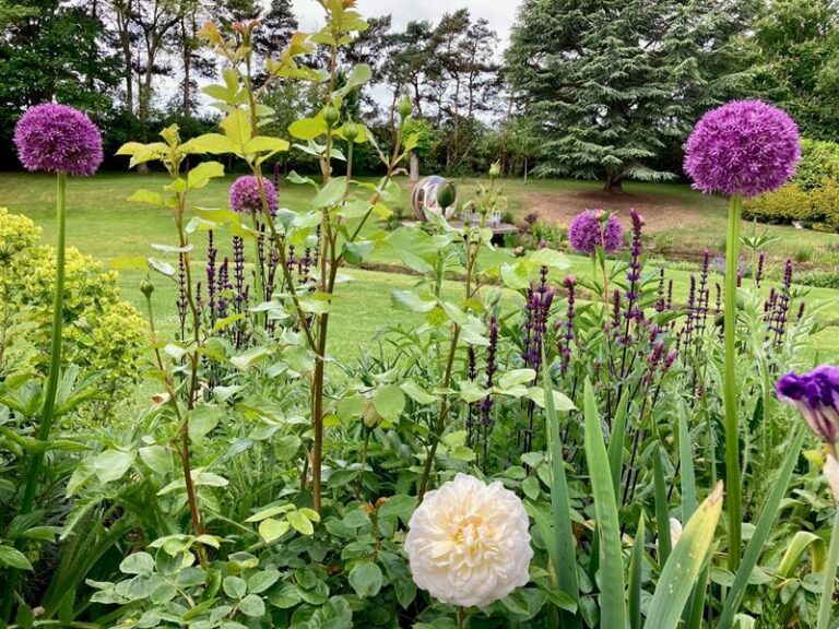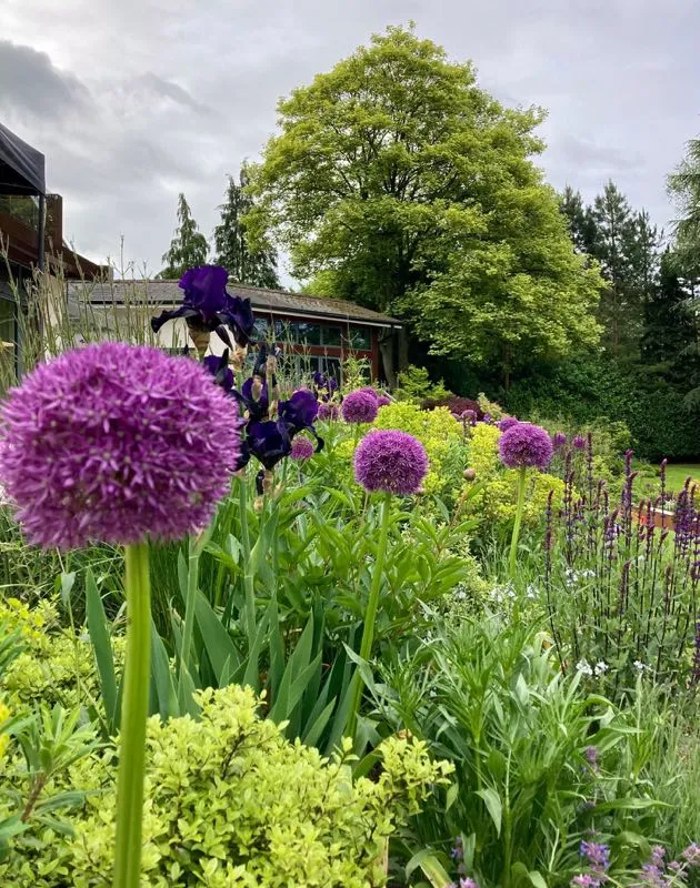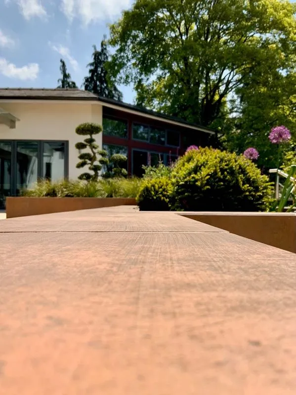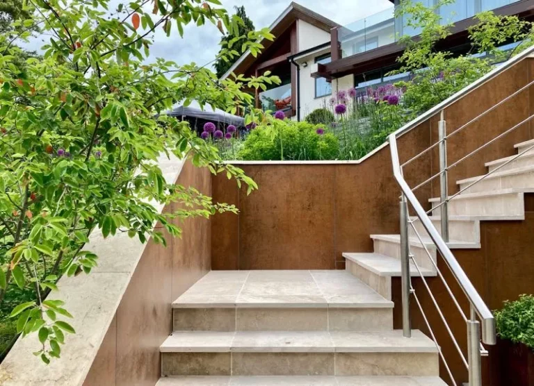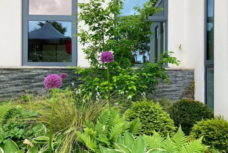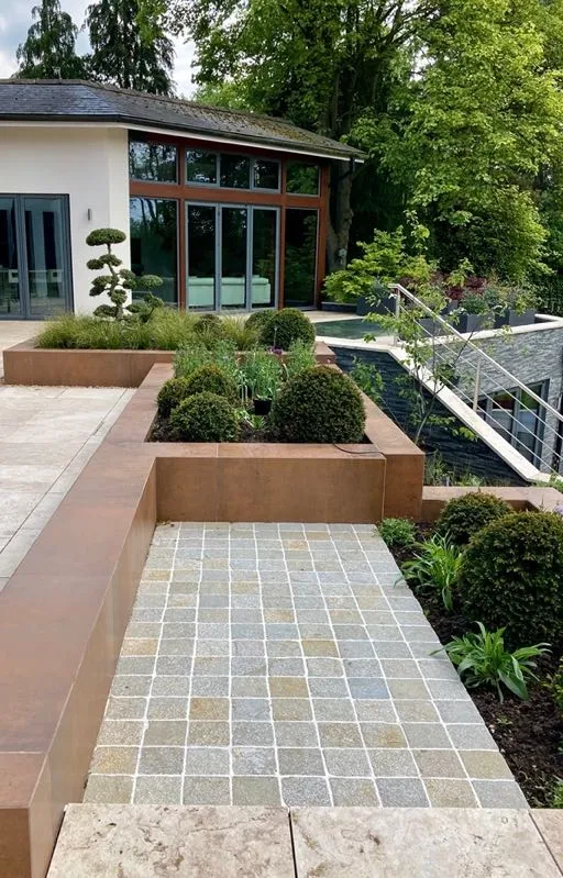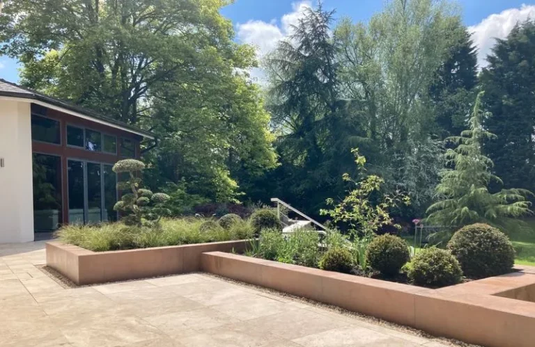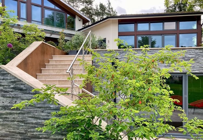 A contemporary space with multiple changes in level transitioned with a series of steps and sloping borders. Porcelain cladding, travertine paving and cedar are the key materials within the design. A large lawn slopes down, utilising existing contours to ‘The Beck’ that meanders through the garden. Rosa Desdemona, Salvias, Hydrangeas and Peonies along with grasses form the basis of the romantic and airy planting.