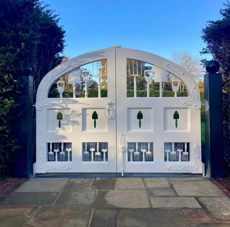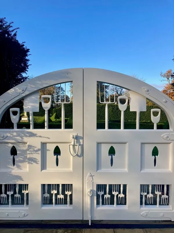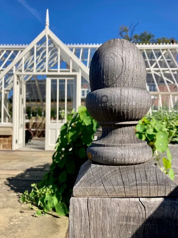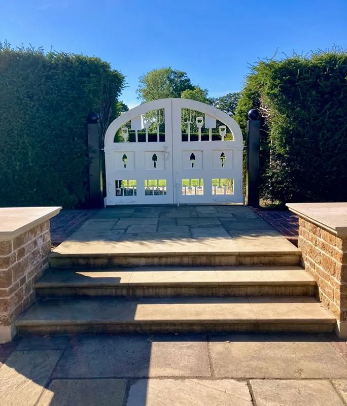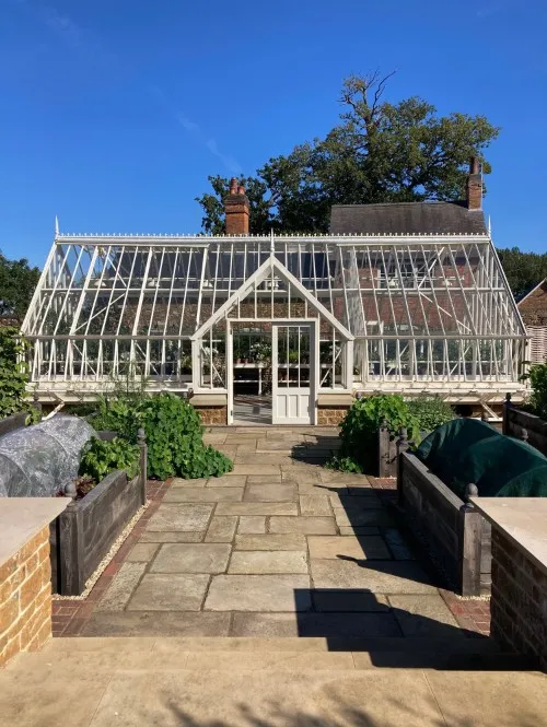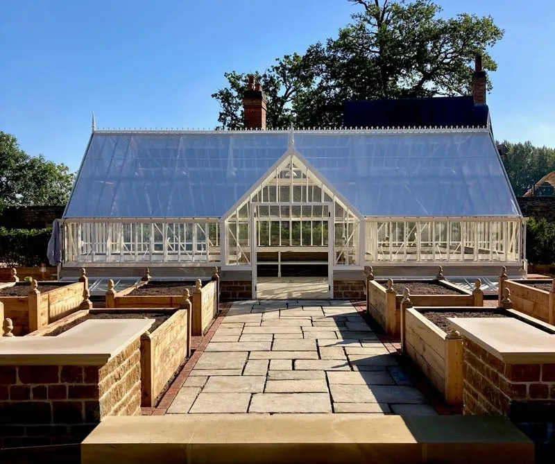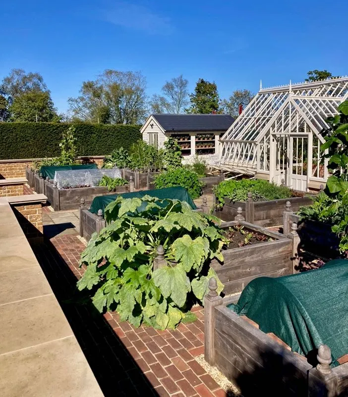 An Aliltex glasshouse forms the centrepiece of this productive kitchen garden.  Paths formed of clay paver and reclaimed York stone provide easy access to the oak raised beds.  Bespoke arched espalier frames provide support for numerous apple and pear varieties.  A bespoke potting shed provides a functional space for sowing and a feature Auricular Theatre adds an element of drama.