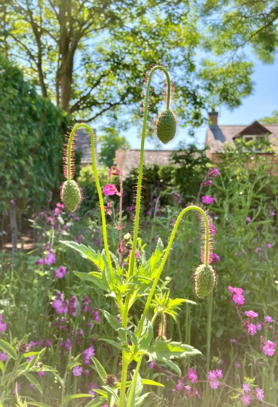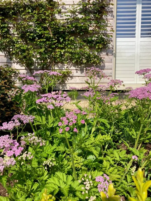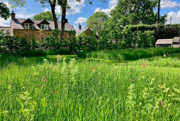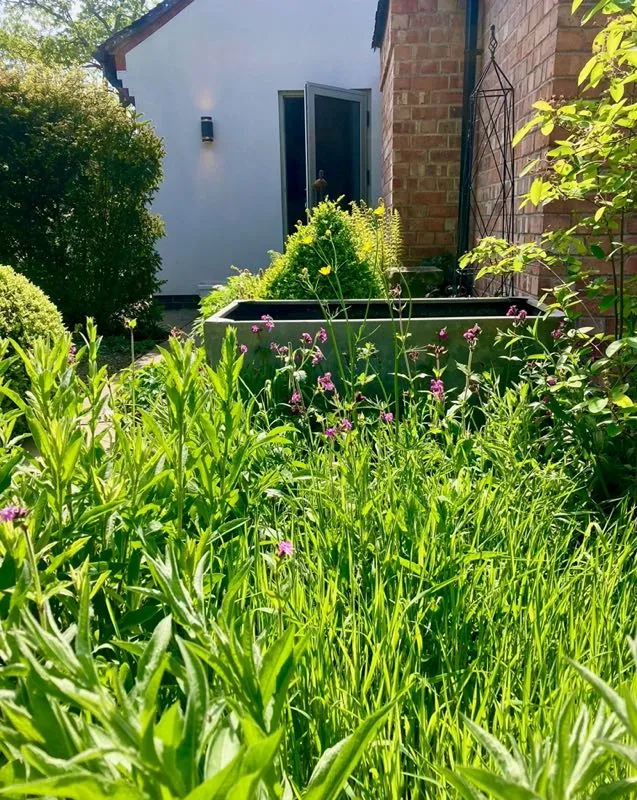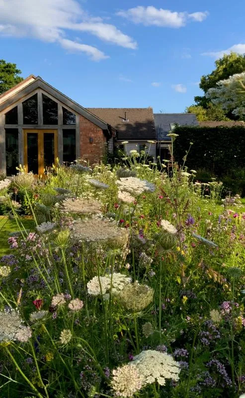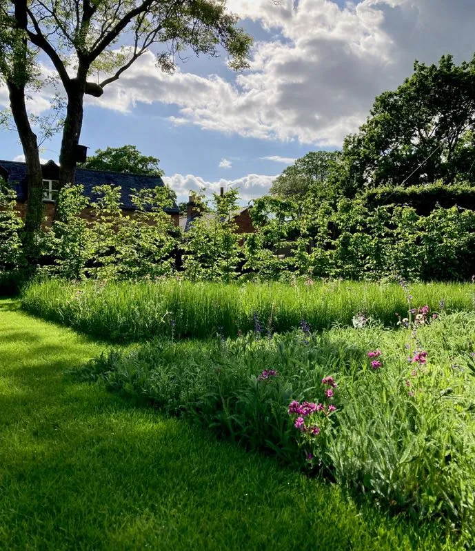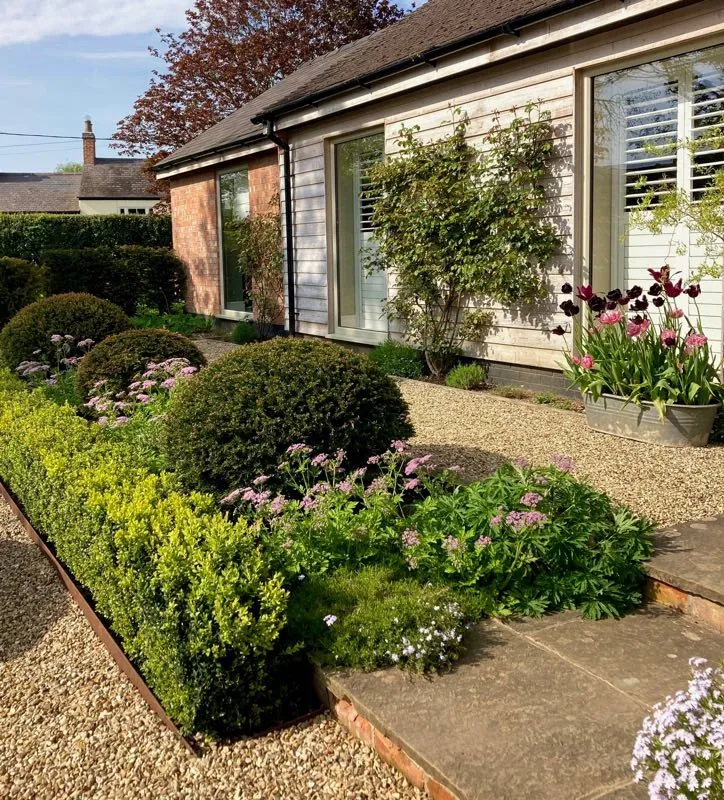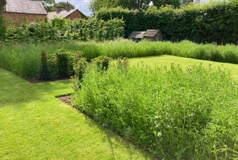 A simple rectilinear design of native wildflower areas, hornbeam hedging, yew hedging and topiary, set against the contrast of tightly mown grass. The gravel driveway to the front of the property is bordered with naturalistic planting set against the clipped yew, providing all round interest. A pleached hornbeam hedge creates a separation to the main garden, which has been designed with multiple areas to retreat within, whether for a doze in the hammock or a laze on the lawn under the dappled shade of the sycamore.